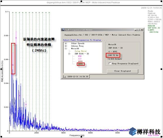 在2009年12月10號,三聯合強制循環熱水泵P-2103/1監測中發現該泵電機軸承雜音大,電機遠端軸承的Peakvue值從之前的0.2突然長到2.5,時域波形有明顯的沖擊,存在明顯的軸承保持架故障特征頻率。如下圖所示