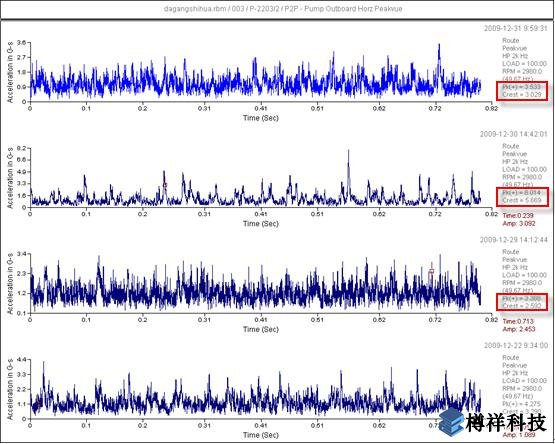 2009年12月30日監測時發現三聯合P-2203/2泵側出口端軸承波形上但突然出現沖擊信號,Peakvue值突然增大,從0.4到0.7,沖擊幅值從3突然漲到8,呈現明顯的沖擊,但振動基本無變化,如下圖所示